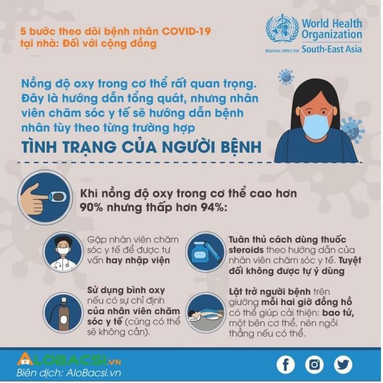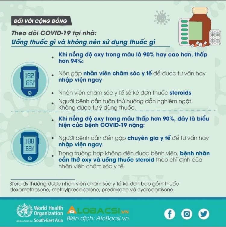 + Nếu SpO2 dưới 95%, nếu tại nhà có máy tạo Oxy có thể thở Oxy liều cao hơn 4-5l/p đến khi tăng SpO2 trên 95% thì có thể giảm Oxy xuống thấp hơn