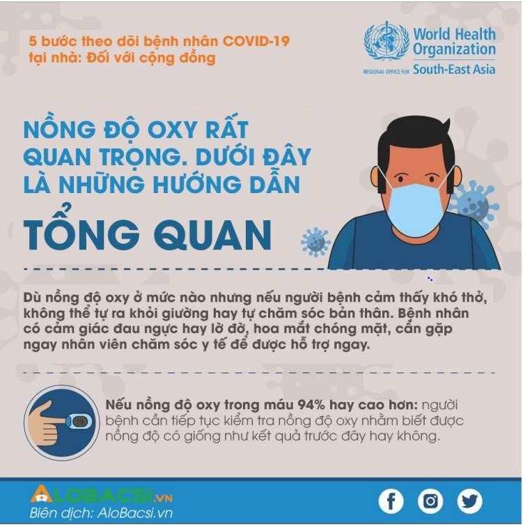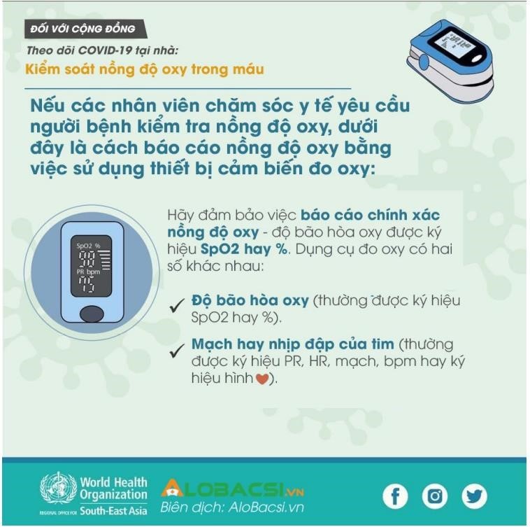 - Thông thường tốt nhất nên kiểm tra Oxy bằng máy đo cá nhân để theo SpO2 mỗi ngày hay khi có cảm giác khó thở (SpO2 bình thường 97 -98%, nên đo khi tay ấm, tay không sơn móng tay, đo ở ngón cái )